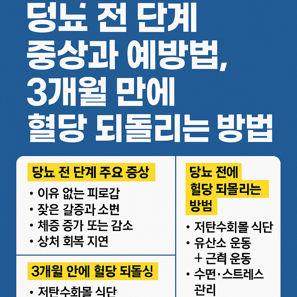 당뇨 전 단계는 ‘돌이킬 수 있는 기회’입니다. 오늘부터 식단, 운동, 수면, 스트레스 관리를 시작하세요. 3개월 후 정상 혈당으로 돌아온 자신을 만날 수 있습니다.